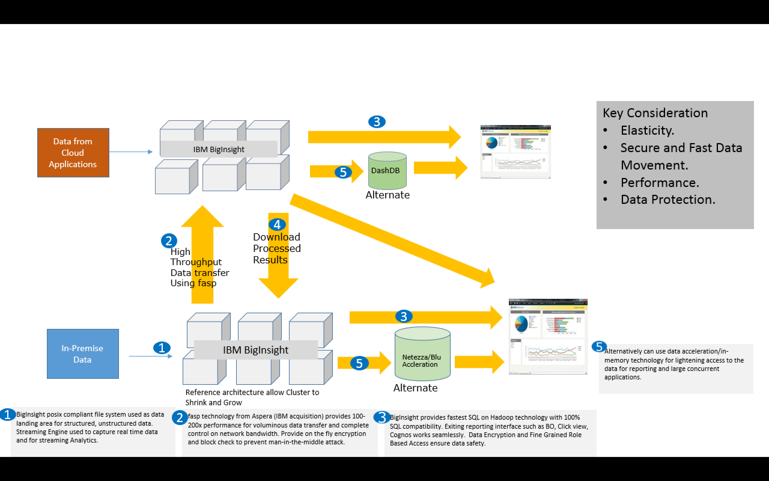 IBM Reference Architecture for BigInsight( hadoop ) provides the flexibility to deploy secure in-premise cluster of any size and cloud offering for BigInsight ( either as PaaS, SaaS, IaaS) helps to provide elasticity.